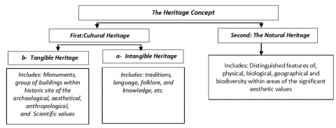 In other respects, in 1972, the World Heritage Convention identified two categories of heritage. The first is the 'cultural heritage,' which concerns tangible items, such as memorial buildings. The second category is 'natural heritage,' which includes outstanding physical, biological, geographical, and biodiversity features in areas of significant aesthetic value [3], as illustrated in Figure 2.
