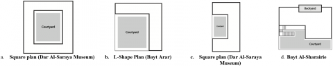 Irbid city contains several traditional houses. Those houses are constructed above the ground level, and they often consist of one floor or two floors. In general, their designs are similar to the design of the Damascene House in Syria and Palestine; the house elements are open to the central open court, which has a water fountain in rectangle, U, or L shape. (Figures 9. a, b. c, and d) display the different traditional house plans in Irbid City [11]. The four examples selected for the study represent the different types of house designs.