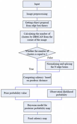The number of boxes depends on the number of clusters obtained in the previous step. If the number of clusters is 1, there is one salient object in the image. Then, the box with the highest voting score was selected for visual saliency detection. If the number n of clusters is greater than 1, there are N salient objects in the image, corresponding to N boxes. The scores of the boxes were sorted in descending order, and the N top-ranking boxes were selected. The images of these N boxes were spliced and normalized. Finally, the saliencies outside the box were set to 0, and the ultrametric contour map (UCM) value was taken as the edge weight of the super-pixel. Drawing on the concept of geodesic distance, the distance between the super-pixel inside the box and the background seed super-pixel at the box edge was calculated as the prior probability. The color distribution in and out of the box was taken as the observation likelihood probability. Then, the Bayesian formula was used to derive the posterior probability, i.e., the final saliency map. The flow of our algorithm is shown in Figure 1.