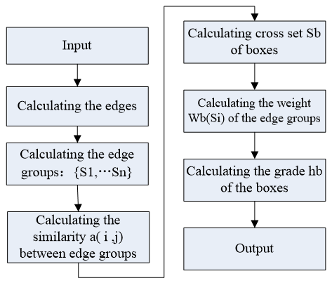 The edge box algorithm computes the score of each sliding window, according to the edge weight of the window. Firstly, the image edges are extracted by a structured edge detector, which is faster and more effective than traditional edge detectors. To count the number of edges completely contained in the sliding window, the algorithm aggregates the edges, and computes the similarity between two edges. Next, the sliding window is slid across the image, and a weight is assigned to each edge within the window. The weight reflects how much an edge is contained in the window. Finally, the weights of all edges in the window are added up, and normalized into the score of the sliding window. The score indicates the possibility that the sliding window contains objects.