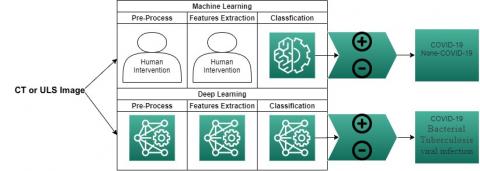 Machine learning (ML) is a branch of AI that focuses on methods that allow computers to infer complicated correlations or patterns from empirical data without needing to be programmed explicitly. ML is utilized in a variety of applications in the healthcare domain, including medical imaging diagnostics, illness diagnoses, smart health records, remote health monitoring, and clinical trials and research. Deep learning (DL) is a derivative of ML, which is the focus of this study. A specific healthcare application task can be accomplished using enormous historical data created by a vast neural network supplied and performed by DL. DL is extremely useful when utilizing computed tomography (CT) and ultrasound (ULS), as it can help in the segmentation of regions of interest, which is helpful in detecting COVID-19 [12]. Preventing such the spread of virus can be accomplished through having precise knowledge of host response and dynamics [13], which is the first step in the creation of an effective DL approach. Learning from existing and simple representations to solve complex problems is one of the most important features of DL [14]. DL allows learning in a deep manner using deep neural networks and has the ability to identify correct representations to present accurate results. This aspect is important, because it can help predict future COVID-19 patterns [15].