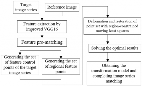 Based on the extracted image series features, the registration firstly relies on Harris corner detector to identify the corners, and then extracts the feature maps, according to the image series feature points outputted by the improved VGG16. Further, the feature maps are imported to the spatial transformation network for pre-registration of image series. Finally, the pre-registration results are deformed, restored, and resampled by region constraint-based moving least squares.