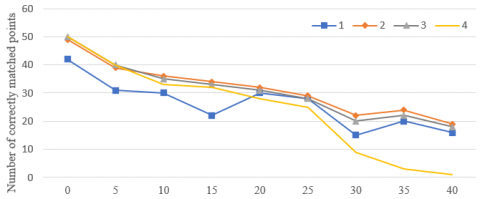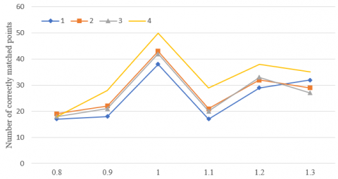 Comparative experiments were designed based on different transformations (e.g., rotation, scaling, and brightness change) to further evaluate the robustness of Harris corner detector in detecting angles, and the proposed region-constrained moving least squares facing different various transforms on the image series. The rotation angle was changed by an interval of 5°, and the scaling and brightness change was designed with an interval of 0.1 (unit: pixel and lumen). The high-performance layers of CONV1-3 and FC2 were tested. The number of correctly matched points were counted after different transformations. The results (Figure 7) show that the orange curve, which represents the features outputted by FC2, outshined all the other curves under different transformations, while CONV3 achieved the best effect in scaling.