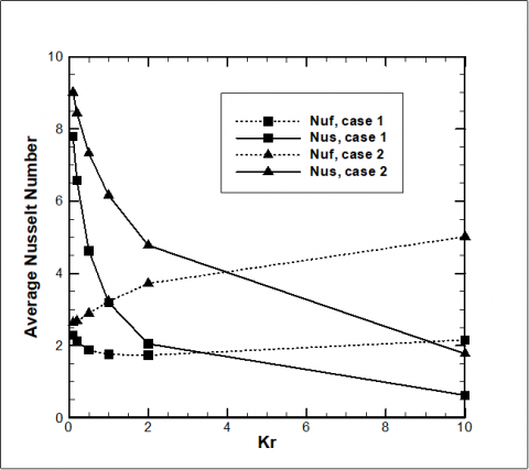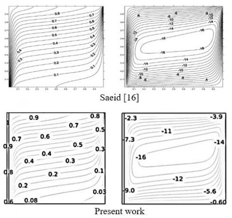 To assess the validity of this solver, the obtained results were compared with the results computed by Saeid [16] for streamline and isotherm contours at (Ra = 1000, Kr = 1 and D = 0.02). The comparison has shown an acceptable agreement between the two sets of results as shown in Figure 3. In addition, Table 1 shows a great match in Nusselt number between previous results with the present results.