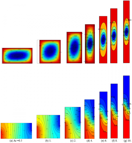 Figures (11-14) demonstrate the effect of aspect ratio on the flow pattern and isotherms contours for different Ra number [Ra = 10, Ra = 103] and different thermally active walls locations at dimensionless finite wall thickness D = 0.1, Kr = 1. It can be seen that a single rotating cell is formed for all aspect ratios for each case of the thermally active walls when the Ra = 10. In addition, increasing Rayleigh number to Ra = 103 leads to the formation of duel inner cells at the left lower part of the enclosure for case-1 when the aspect ratio A = 0.5. further increase of aspect ratio leads to the formation of two inner cells at the right upper and left lower parts of the enclosure. While for case two, only inner circle formed in the enclosure which makes the heat transfer rate is still better for case two under various aspect ratios. The isotherm indicates that the temperature is distributed well in the enclosure for all aspect ratios. It can be noted form the isotherm contour that the heat transfer rate is enhanced in case two (Bottom-Top) of the thermally active location as the isotherms lines in case two are more curved which is an indicator that the heat transfer rate is improved.