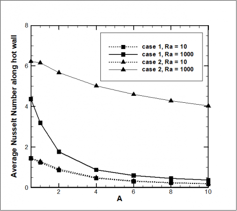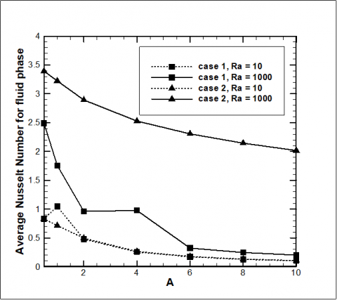 The effects of the aspect ratio and partially thermal active wall on the Nusselt number for fluid phase and along the solid hot wall are presented in Figures 15 and 16 respectively. As the aspect ratio increases, the Nusselt number for the fluid phase decreases. However Nusselt number for the fluid phase at case 1 and Ra = 10 increases when aspect ratio increase from A = 0.5 to A = 1 and then still decreasing as the aspect ratio increases. Nusselt number along the hot solid wall still decreases as the aspect ratio increases.