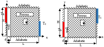By considering the Cartesian coordinates, two-dimensional porous rectangular cavity was used to model the natural convection fluid flow and heat transfer characteristics. The flow is driven due to buoyancy impact because of temperature variations. The Navier-Stokes governing equations may be written in the form presented below [28]: