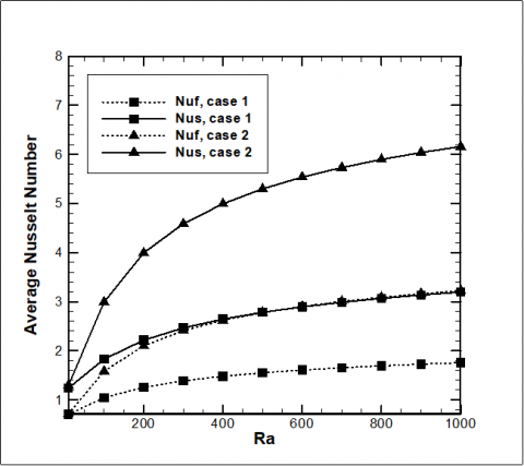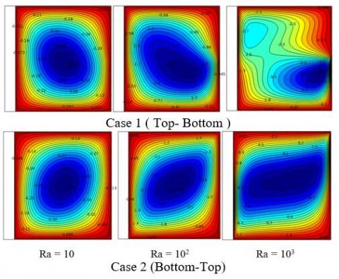 Figure 6 shows the effect of the thermally active wall location on the rate of heat transfer. It can be seen that the average Nusselt number for case 1 is higher than that corresponding of case 2. It can be also noted that for each case of thermally active wall, the average Nusselt number for the fluid phase and along the hot wall increase as the Rayleigh number increases. For example, for case 1, when the Rayleigh number increased from Ra = 10 to Ra = 103, the average Nusselt number for the fluid phase increased from $\overline{N u_{f}}=0.7047$ to $\overline{N u_{f}}=1.7573$. Similarly, $\overline{N u_{w}}=1.2388$ at Ra = 10 while $\overline{N u_{w}}=3.1958$ at Ra = 103. This increase in the rate of heat transfer also observed for case 2 but in a higher rate compared to case 1.
