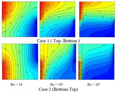 Figure 1 illustrates the schematic diagram of the enclosure filled with porous medium. It can be seen that case-1 (Top-Bottom) and case-2 (Bottom-Top) are partially active thermal zones with finite thickness wall on both sides. Homogeneous, isotropic, and saturated with incompressible fluid assumptions are applied for the porous medium. All properties are assumed to be constant except the density which is described by the Boussinesq approximation.