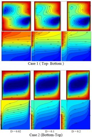 Figure 4 demonstrates the fluid flow and the isotherms behaviour for various dimensionless Rayleigh number for two cases of thermally active wall locations and [D = 0.1, Kr = 1, (A = 1)]. The streamlines show that the strength of circulation inside the porous enclosure increases with increasing the modified Rayleigh number for both cases. For example, stream function increased from $|\psi|_{\max }=1.8073$ at Ra = 100 to $|\psi|_{\max }=4.7922$ at Ra = 103. The reason behind that is that as the modified Rayleigh number increases, the intensity of the fluid flow circulation will increase because of the buoyancy force and natural convection that become very strong leading to an increase of the stream function. Also, it may be noted from the streamlines contours that the location of the thermally active zones have an influence on the stream function value. For example, the stream function value for case one was $|\psi|_{\max }=4.7922$ while for case 2 it was $|\psi|_{\max }=12$. Accordingly, the heat transfer rate resulting from case two will be higher than that of case one. The reason behind that is the two inner vortexes which are created in the middle of the enclosure and reduced the rate of heat transfer. The wall location also has great influence on the isotherm contour, where it is not curved too much in the middle of the enclosure at Ra = 103 for case 1, while for case 2 it is significantly curved which enhanced the rate of heat transfer as in Figure 5.