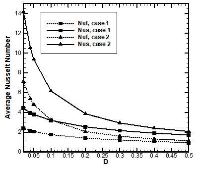 The effect of dimensionless wall thickness for various walls location of average Nusselt numbers for both the fluid phase and along the hot wall is discussed in Figure 6. For example, when the wall thickness increased from D = 0.02 to D = 0.2, Nusselt number for the fluid phase and along the hot wall decreased from $\overline{N u_{f}}=2.3851$ to $\overline{N u_{f}}=1.4027$ and from $\overline{N u_{w}}=4.4244$ to $\overline{N u_{w}}=3.1958$ respectively. Figure 8 shows the average Nusselt number for various dimensionless finite wall thicknesses. It can be clearly seen that the Nus and Nuf are decreasing with increasing the dimensionless finite wall thickness (D). It can be noted that for each case of thermally active wall that the average Nusselt number for the fluid phase and along the hot wall as the dimensionless finite wall thickness increases.