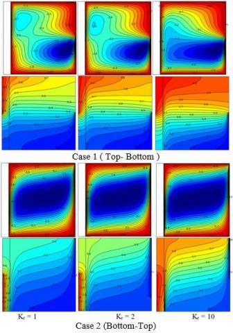 Figure 9. Streamlines and isotherms for various thermal conductivity ratio for Top-bottom and Bottom-top