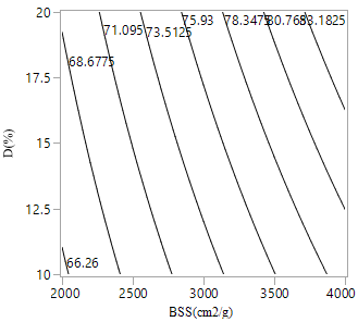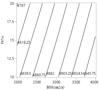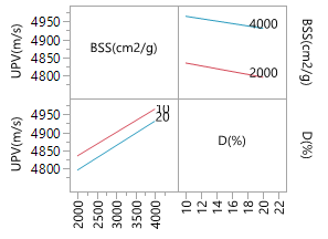 $\begin{aligned} \operatorname{UPV}\left(\frac{\mathrm{cm} 2}{\mathrm{~g}}\right)=4881.5+66 \frac{\mathrm{BSS}-3000}{1000}-18.16 \frac{\mathrm{D}-15}{5}+1.5 \frac{\mathrm{BSS}-3000}{1000} \cdot \frac{\mathrm{D}-15}{5} \end{aligned}$ (3)