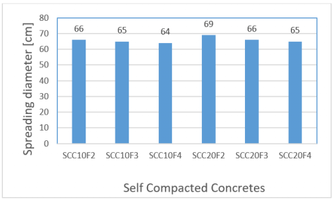 In regards to standard value of the flow diameter are usually in the range between 60 and 75 cm for SCC mixtures. It could be observed from Figure 1 that the higher percentage of the fineness of the limestone filler increases the water demand, which causes a decrease of workability expressed in the slow spread of the SCCs [3, 27, 28]. It is observed that the fluidity is slightly greater by increasing the SSB of limestone for all most the mixes.