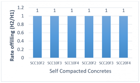 It is noticed in Figure 2 that all the prepared SCCs have H2/H1 = 100% and the incorporation of limestone filler in mixtures up to 20% ensures an ease of casting for such mixtures. Furthermore, the variation of the fineness of limestone fillers with BSS that ranges from 2000 to the maximum value 4000 cm2/g and the dosage of filler 20% does not negatively affect the passage and filling capacity of SCC and consequently permit the ease of casting in confined zones that contribute to the dynamic stability [19].