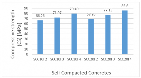 The compressive strength (CS) is estimated at 28 days of hardening and presented in the Figure 4. The minimum value of the mechanical strength is 66.26 MPa (SCC10F2); it refers to the SCC which presents the minimum value of SSB 2000 cm2/g and dosage of filler 10%. Mechanical resistance increases with increasing BSS and dosage of filler up to a value equal to 85.6 MPa (SCC20F4); the SSB that presents the maximum value of the BSS 4000 cm2/g and the dosage of filler 20%. It is noted that the increase in the SSB of the limestone filler; increases the compressive strength thus the increase greater dosage of limestone filler increases the compressive strength. Indeed, the obtained values for CS at a dosage of 10% for limestone show a percentage of improvement up to around 20% for SCC10F2 (BSS= 2000 cm2/g) compared to SCC10F4 (BSS= 4000 cm2/g). Furthermore, the percentage of 20% limestone fillers incorporation register an increase of up to 25% for SCC20F2 and SCC20F4, respectively.