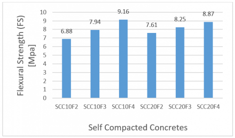 Figure 5 presents the flexural strength (FS) at 28 days age of hardening for the different SCC studied mixtures. The minimum value of the flexural strength is 6.88 MPa for SCC10F2 and increases up to 9.16 MPa for SCC20F4, respectively. It is mainly depending on the degree of fineness and dosage of limestone filler. Again, it is noted that important fineness (BSS) of the limestone filler increases the flexural strength, thus the higher is the dosage of limestone filler up the greater is the flexural strength recorded overall the studied SCCs. This percentage reaches 20% once comparing SCC10F2 with SCC20F4 mixes; this is in accordance with other research study [30].