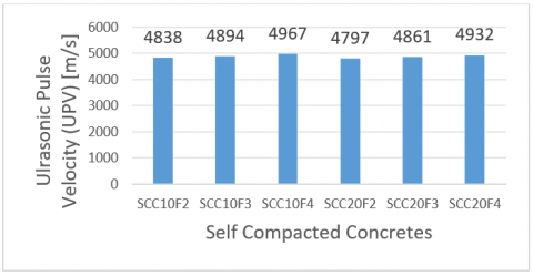 The Ultrasonic Pulse Velocity is determined at 28 days age of hardening and presented in the Figure 6. The Ultrasonic Pulse Velocity values of all the SCC are greater than 4000 m/s which means excellent resistance and proves the good quality of the confected SCC concrete based on limestone addition. It can be seen that combined higher SSB of the limestone filler or the dosage increases the ultra-sonic speed. Which reflected the increase in the mechanical resistance of almost SCC mixtures. One can conclude that these results of NDT test correlated well with compression test previously discussed and judged to be more reliable in assessing the concrete of the SCC with limestone incorporation filler in the present study as reported by other research work [31].