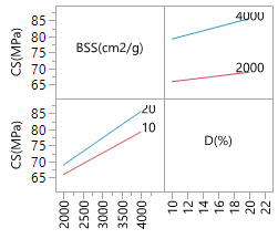 Figure 11.a (Main effect) describe the effect of the two factors on the flexural strength it may be noted that the BSS of limestone powder reproduces a stronger positive effect on the flexural strength, in the same context, the limestone powder content has a small positive effect on this response. These results are dependable with the estimated coefficients (Table 10) and Eq. (2);