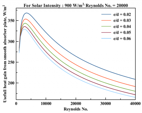 f = 0.085Re-0.25 for smooth plate solar heater f = 0.14408Re-0.17103(e/d)0.1765(α/90)0.1185 Nu= 0.001047Re1.3186(e/d)0.3772(α/90)0.1198 |