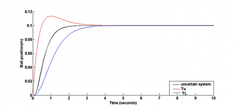 The constraints for robust stability have been achieved where the nominal system lies between the upper tracking and lower tracking boundaries Figure 9 shows ball position in frequency domain. It is obvious that the response of the nonlinear system with uncertain parameters lies between the given tracking boundaries as shown in Figure 10. Also, it was found that the response of the Figure 11 shows the response of the uncertain system in the frequency domain. It is clear that the robustness requirements were satisfied by the proposed controllers.
