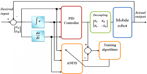 Figure 3 explains the simplified form of the general control concept based of the WMR dynamics and kinematics. The role of path generator is to supplies the desired variable x, y and θ, a back-stepping act as a kinematic controller, located in the external loop, this controller measures the difference between the recommended signals (taken from the bloc trajectory generator) and real value from the robot, at next realizes its own linear speed and angle which they are passed to the internal loop, where two ANFIS-PID controller deal with the dynamics. Here, the two dynamic controllers give their own angular and linear speeds based on the data selected from the kinematic controller.