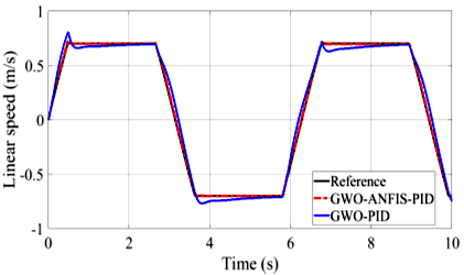 Here, a progressive variation in both linear and angular speed is applied for that purpose, results proves that the GWO-ANFIS-PID controller better handling with smooth trajectory than the GWO-PID controller, due to a minimum tracking error from the suggested controller than the GWO-PID one. Moreover, since the PID controller gives a very high overshoot in the linear velocity response at starting time. Which makes him. unsupported for handling the tracking issue.