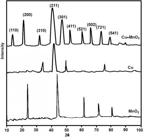 X-ray diffraction was used to describe MnO2, Cu, and Cu doped MnO2 nanoparticles, as shown in Figure 3. The MnO2-Cu XRD images show strong, powerful peaks in the produced nanoparticles, which are extremely crystalline in nature. All of the detected peaks have a tetragonal crystal structure. The diffraction peaks at 15°, 24°, 33°, 43.4°, 49.3°, 53.7°, 62.3°, 67.5°, 73.8°, and 81.4° correspond to the (h k l) planes (110), (200), (310), (211), (301), (411), (521), (002), (721), and (541) set to tetragonal structure and the MnO2-Cu space group. The peak values of the acquired XRD spectrum compared to the standard established that the manganese oxide nanoparticles generated were in the form of crystals. The (111), (200), and (220) planes of Cu, which may be indexed to Cu's fcc structure, were attributed to the characteristic peaks around 43.3°, 50.4°, and 74.1°, respectively. However, only samples connected with the (110), (111), and (220) planes of Cu2O nanomaterials showed minor peaks at roughly 29.7°, 36.4°, and 61.4°.