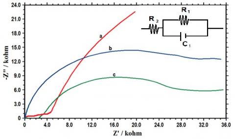 Figure 6. Impedance spectroscopybehavior of a) MnO2 ; b) Cu; c) Cu doped MnO2 Nanoparticles. (Inset; Nyquist equivalent circuit)