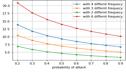 The jammer occupies the frequency randomly at a random time. To analyze the jamming effect, the system model has taken the 6 different frequencies used by the CRIoT node. The game is formulated such that the CRIoT node will make a strategy of occupying the frequency which is not jammed by the jammer from the six frequencies. Similarly, the jammer will create a strategy of occupying the frequency which is being used by the CRIoT node. Under this game, the CRIoT node tries to maximize the achievable rate by selecting unoccupied frequency by the jammer, whereas the jammer playing the game to minimizes CRIoT node spectral efficiency by occupying the same frequency, which is being used by the CRIoT node. By keeping the SNR value as constant and the transmitted power of the CRIoT node and jammer power also as a constant, the game is played between the jammer and CRIoT node and the performance measurements are obtained for different frequencies. The performance is plotted between the spectral efficiency of the CRIoT node and the different probability of being occupied by the same frequency by the jammer. The Figure 5 shows the performance measure measurement of such game when CRIoT node uses two different frequencies, three different frequencies, four different frequencies and six different frequencies. From the plot, it is evident that if the number of frequency used by the CRIoT node is more, then the probability of getting higher spectral efficiency is higher. This is happening because if the number of frequencies is more, then the CRIoT node has more choice of selecting the frequency that is not being jammed by the jammer with the highest probability. On the other hand, the jammer has the lowest priority to select the occupied frequency of the CRIoT node when the number of frequencies used by the cognitive radios is more. From the Figure 5, we can observe that we can achieve a maximum of 20bits/sec/Hz spectral efficiency when the CRIoT node is using six different frequencies at the probability of an attack of the jammer is 0.2. It can be observed that the achievable spectral efficiency decreases with respect to the possibility of occupancy of the jammer at the same frequency. For example, the capacity reduces from 20bits/sec/Hz to 10bits/sec/Hz when the probability of jamming increases from 0.2 to 0.9. The lowest performance is observed when the CRIoT node uses only two different frequencies with 6.9 bits/sec/Hz when the probability of an attack is 0.2, which is getting reduced by 0.19 bits/sec/Hz when the probability of an attack is 0.9. Other levels of moderate performance can be observed when the frequency by CRIoT node is 3 and 4. We can also observe from the Figure 5 that whenever the number of frequencies used by the CRIoT node increases, the spectral efficiency is growing by the factor of 2.5 bits/sec/Hz approximately for every single frequency usage increment. When the number of frequencies is higher, then there is a greater probability of available free spectrum to use, so most of the time the cognitive radio will have the choice to use free spectrum. Since the probability of using the free spectrum is higher, which results in higher spectral efficiency.