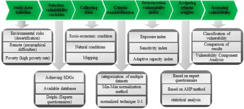 From the discussion of extensive literature, we assume that efficient vulnerability assessment requires an appropriate methodology or framework. In addition, to design a new vulnerability framework, it is necessary to reformulate the various components of structural vulnerability for lagging regions (economic, climatic, social, political, etc.) by specifying the criteria that vulnerability indicators have to meet for their expected use. Therefore, the framework was designed through a set of methodological steps to derive a multidimensional vulnerability index to assess the lagging regions, as shown in Figure 1.