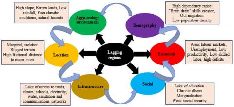 The phenomenon of lagging regions is widespread in developed and developing countries. However, the definition used to classify areas as (lagging), (less developed), (backward), or weakly integrated is different according to the policy objectives and strategies of national governments [1]. There seems to be some conceptual ambiguity surrounding the term "lagging" Academic literature concentrating on less developed regions often refers to them as lagging regions, leading to the exchangeable use of the concepts [2]. For example, in the context of the European Union, lagging regions are classified into two specific types (low-income regions), which cover all areas with a GDP per head in PPS below 50% of the EU average. And (Low-growth regions) cover the less developed and transition regions (low productivity and high unemployment) [3]. Although the importance of economic outcomes is to describe what counts in the lived affairs of societies and is also used to categorize the regions, social dimensions (health, teaching, access to information, justice, and voice, among others) are important targets for development. Additionally, the growth potential of an area depends on a combination of location-specific factors and how densely populated it is. So-called peripherality (low proximity, as determined by access to the market, the relationships the area has with other regions through flows of people, labor, finance, goods, services, and resources) is a defining feature of lagging regions [4].