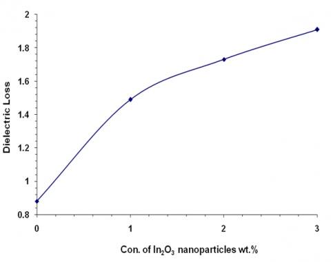 Figures 1 and 2 demonstrate the behaviors of ε' and ε" with frequency of blend/In2O3 nanomaterials. The dielectric constant and loss are reduced when the frequency rises. The ε' and ε" values of blend/In2O3 nanostructures at a low frequency may be related to the effect of interfacial polarization or Maxwell– Wagner–Sillars. The influence of In2O3 NPs content on the ε' and ε" of PVA/PEG/In2O3 nanostructures are illustrated in Figures 3 and 4. The rise in values of ε' and ε" related to increase the charge carriers [18-25]. On the other hand, at high frequencies, dielectric constant and dielectric loss were found to be relatively constant with frequency. This is lead to the field periodical reversal takes place so quickly that the charge carriers will hardly be able to orient themselves in the direction of field resultant in the reduce in dielectric constant and dielectric loss. At low In2O3 NPs concentration, the dielectric constant and dielectric loss values are less. The rise of In2O3NPs concentration led to rise in the average number of concentrations among the In2O3 NPs. At higher concentrations of In2O3 NPs, the dielectric constant and dielectric loss are as a result of a continuous network formation of nanostructures during the nanocomposite [26].