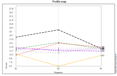 The outputs of processing using MULTIPOL are (1) a score table for evaluation of scenarios (Si), policies (Pj), and actions (Ak) on the criteria with the assessment method. The higher the score, the better; (2) the profile map shows the best policies and actions with high values and low standard deviations; (3) from the sensitivity map, the best policy/action has a high average value, and a low standard deviation; (4) closeness map describes the closeness between action and policy as well as policy and scenario.