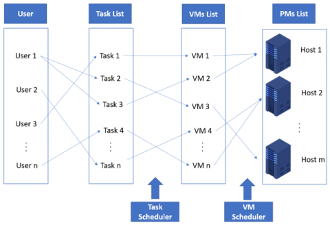 The techniques for assigning resources to particular activities are referred to as scheduling. Utilizing scheduling algorithms is mostly intended to raise the caliber of cloud computing. In order to do this, average waiting times and makespan must be kept to a minimum while utilization is increased. Scheduling the cloud's resources are categorized into two levels: virtual machines (VMs), and host. At the host level, VMs are assigned to physical machines (PMs) by using a VM scheduler, this level is known as VM scheduling. Tasks at the VM level are assigned to VMs for the purpose of execution by using a task scheduler, this level is known as Task Scheduling [5], as shown in Figure 2. This study will concentrate on the VM level, with the goal of scheduling tasks, which is the most difficult issue in cloud computing.