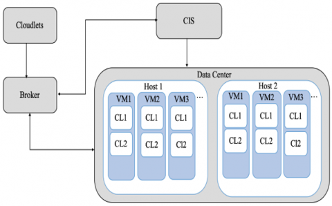 CloudSim affords a set of functions that form the basis of the cloud environment including: Cloud system entities' creation (data center, broker, hosts and VMs), simulation clock management, tasks handling and queuing, and connection between cloud components. The Cloud Information Service (CIS) is a component of CloudSim that includes the entire data center information. The data center has one or more physical machines (hosts), which include many of the VMs. VMs are responsible for executing the tasks and applications which are called cloudlets in CloudSim. The broker is responsible to assign the VMs to a particular host, then assign the cloudlets to the VMs. When the cloudlets of a specific VM completed, then the broker will destroy the VM that is finished all its cloudlets [14]. Figure 3 shows the CloudSim entities.