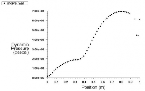 Figure 24. Dynamic pressure distribution along the position for moving wall velocity of 10 m/s