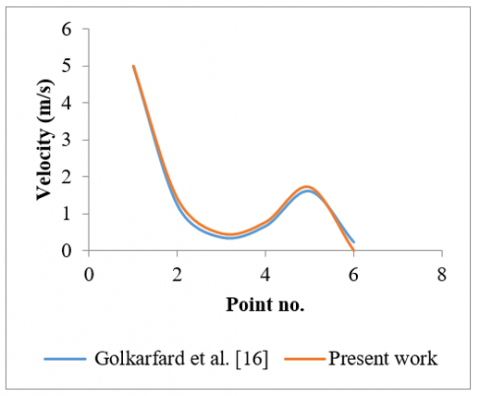 Figure 3. Comparison of velocity distribution between current study results and Golkarfard al. [16] for top moving wall velocity of 5 m/s