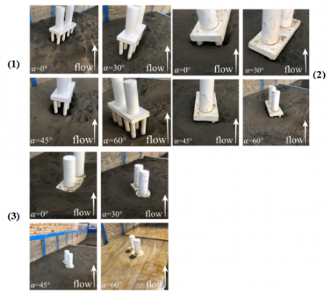 (3) For complex piers skewed to flow direction, maximum scour depth typically occurs at downstream end of upstream row of piles, where pile group is exposed after scouring; maximum scour depth occurs at two upstream piles, or under front edge of pile-cap, depending on degree of pile-exposure cap's after scouring, when pier is aligned to flow; and maximum scour depth typically occurs at middle two piles, when pier is perpendicular to flow. Maximum scour depth generally occurs in front of pile-cap (aligned pier) or at pile-side for piers when pile-cap is partially submerged after scour. cap's (skewed pier). If pile-cap is completely submerged after scouring, as in column-only case, maximum scouring depth occurs at one of column's upstream edges. Typically, this situation shows the deepest scour.
