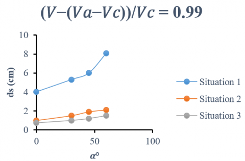 This is a follow-up experiment to [30, 31]. where skewness angle was the most important parameter in both. Experiments were conducted at angles (α= 0°, 30°, 45°, and 60°). In general, when the skewness angle increases, local scour depths increase considerably. However, this increase is more apparent at most upstream pier, which is skewed downstream. When most upstream and most downstream piers are situated at a skewness angle of α=60° in the downstream and upstream directions, respectively, scours developed around front piers increase by 35–50% compared to scours developed around vertical piers. Nonetheless, increased scour depths have been observed in skewness with asymmetry of very upstream pier. Around second pier, a 10-15% increase in scour depth was observed. Most downstream piers are skewed upstream; hence, an increase in scour depth may be expected as skewness angle increases. However, based on experimental results, there is no clear differentiation in scour depth. As skewness angle increases, intensity of vortices that move sediment particles around piers increases. When approach flow hits skewed pier, down-flow is separated into its components, and vertical component of down-flow decreases. Around cylindrical piers, smaller scour holes are created, and aggradation downstream of pier group decreases. Figure 4 shows variability in equilibrium scour depths with respect to skew-angle, as indicated in following figure.