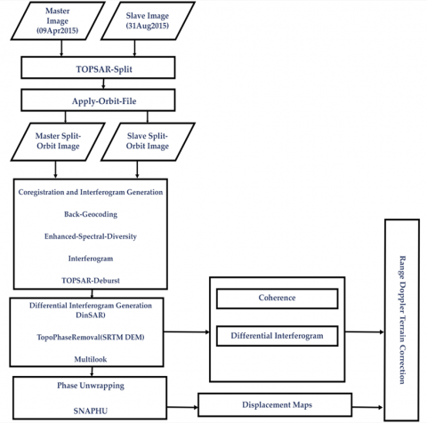 To counteract the erroneous effects of terrain on satellite tilt and backscatter readings, a Range Doppler Terrain correction was carried out. Using reference DEM data and an external exact orbit to obtain specific geolocation information allows for the removal of these aberrations. This process is applied to the differential interferogram, displacement map, and coherence to perfectly export them for viewing on a google earth map. Figure 5 depicts the total process flow for the technique segment.