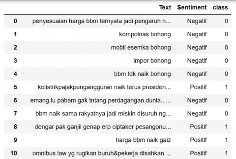 In this data collection process using datasets from Twitter regarding the increase in fuel in Indonesia. This dataset was taken as many as 500 Twitter comments responding to the fuel increase. In the 500 data is processed by filtering the same words or duplicates then in the process obtained 242 data in accordance with the topic of the increase in fuel. For data as much as 258 does not match the topic, then the data is not used or the data will automatically be deleted. After filtering the data, the 242 data are labeled or sentiment classes to determine which words are positive and which words are negative. Obtained positive data as many as 62 documents and obtained negative data as many as 180 documents, the following data has been labeled or positive and negative classes described in Table 2.