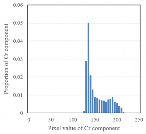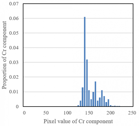 In the YCbCr color space, the Cb channel represents the difference between the blue component and the brightness, and the Cr channel represents the difference between the red component and the brightness. Generally, the proportion of Cr component in the flame is higher because there is more red component in the flame; while for flame-like substance and no-fire conditions, the proportion of Cr component in lower. In the meantime, the proportion of Cb component in the flame is lower because there is less blue component in the flame. By analyzing the distribution of Cb and Cr channels, the flame, flame-like substance and no-fire conditions could be distinguished effectively. Figure 4 gives the proportion of Cr component under flame, flame-like substance and no-fire conditions, as can be known from the figure, flame colors usually have high sharpness, and the Cr channel of the YCbCr color space can well describe the red component in the flame, which helps to distinguish flame from other substances.