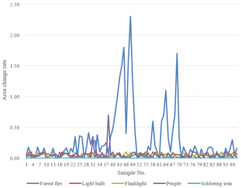 1. Through data observation and analysis, it is found that the change of dynamic features such as the area change rate of suspected forest fire area with the frame number is greater than that of light bulb, flashlight, people, and soldering iron, and this proves that such dynamic features can be used to distinguish fire from other substances.