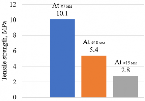 Thus, as the temperature decreased, the compressive strength values also decreased, despite the difference in sample size. However, the samples with a larger surface area had a much lower tensile strength at lower temperatures. The nut diameter of 15 mm corresponded with the tensile strength of 2.8 MPa, and the average value for this diameter was 5, 4 MPa.