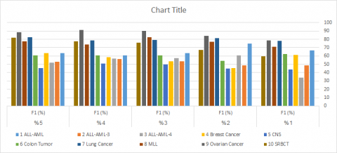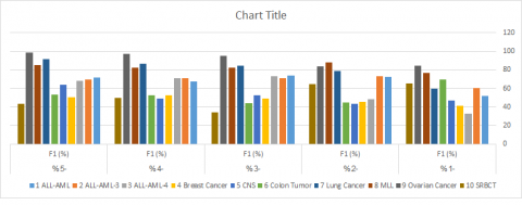 Figure 30. F1 evaluation metric of KNN for the ten microarray datasets using Chi Square algorithm