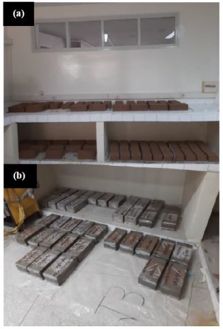 Figure 12. Storage and curing of (a) non-stabilized blocks, (b) cement stabilized blocks
