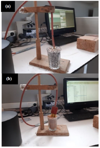 The thermal properties of soil, CMS and CEB were determined by the TPS 1500. The TPS is a Hot Disk thermal constant analyzer designed to measure the thermal transport properties according to ISO 22007-2 [39]. The Hot Disk analyser consists of a nickel double spirale sandwiched between two thin insulating sheets (Kapton, Mica, etc.). It acts as a heat source as well as a dynamic temperature sensor by passing a sufficient electrical current to raise the sensor's temperature while simultaneously recording the temperature increase as a function of time. The thermal conductivity measurement of CMS Figure 16 (a) and soil Figure 16 (b) was performed by inserting the Hot Disk sensor within the material. Each test was performed three times, and the average values are summarized in Table 4.