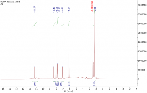 The structural formula of the compound was confirmed by proton 1H-NMR spectroscopy. Singlet signal was seen for compound (A) at [=2.31 ppm (s,3H), CH3]. A Singlet signal appeared at [δ=6.14ppm, (s,1H)] refers to a proton five ring and the singlet signal at [δ=7.07ppm, (s,2H) NH2]. While the multiple signals at [δ=7.86-8.42ppm, (m,3H, CH Arom)] . and Singlet signal appeared at [δ =11.27 ppm, (s,1H,NH)] (14) (Figure 1).