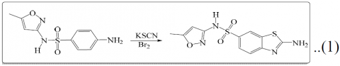 Dissolved 0.02 mol of Sulfamethoxazole in glacial acetic acid as a solvent with the addition of 0.02 mol potassium thiocyanate in the presence of bromine. After 10 hours of refluxing, the mixture was neutralized with 10% sodium hydroxide, the reaction mixture was allowed to cool, filtered, and the precipitate was collected and recrystallized from ethanol. The process was repeated three times. The chemical compound in question exhibits a molecular formula of C11H10N4O3S2, possesses an orange hue, displays a melting point range of 132-134 ℃, and has a yield of 84%. As in the following equation: